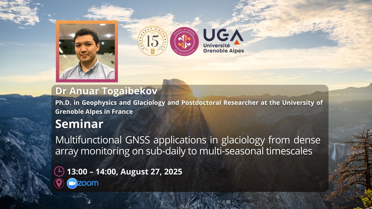 The School of Mining and Geosciences at Nazarbayev University invites you to a guest seminar by Dr. Anuar Togaibekov, an expert in glaciology and geophysics, who will present his research on how Global Navigation Satellite Systems (GNSS) can be used as high-resolution tools for glacier monitoring across multiple timescales.