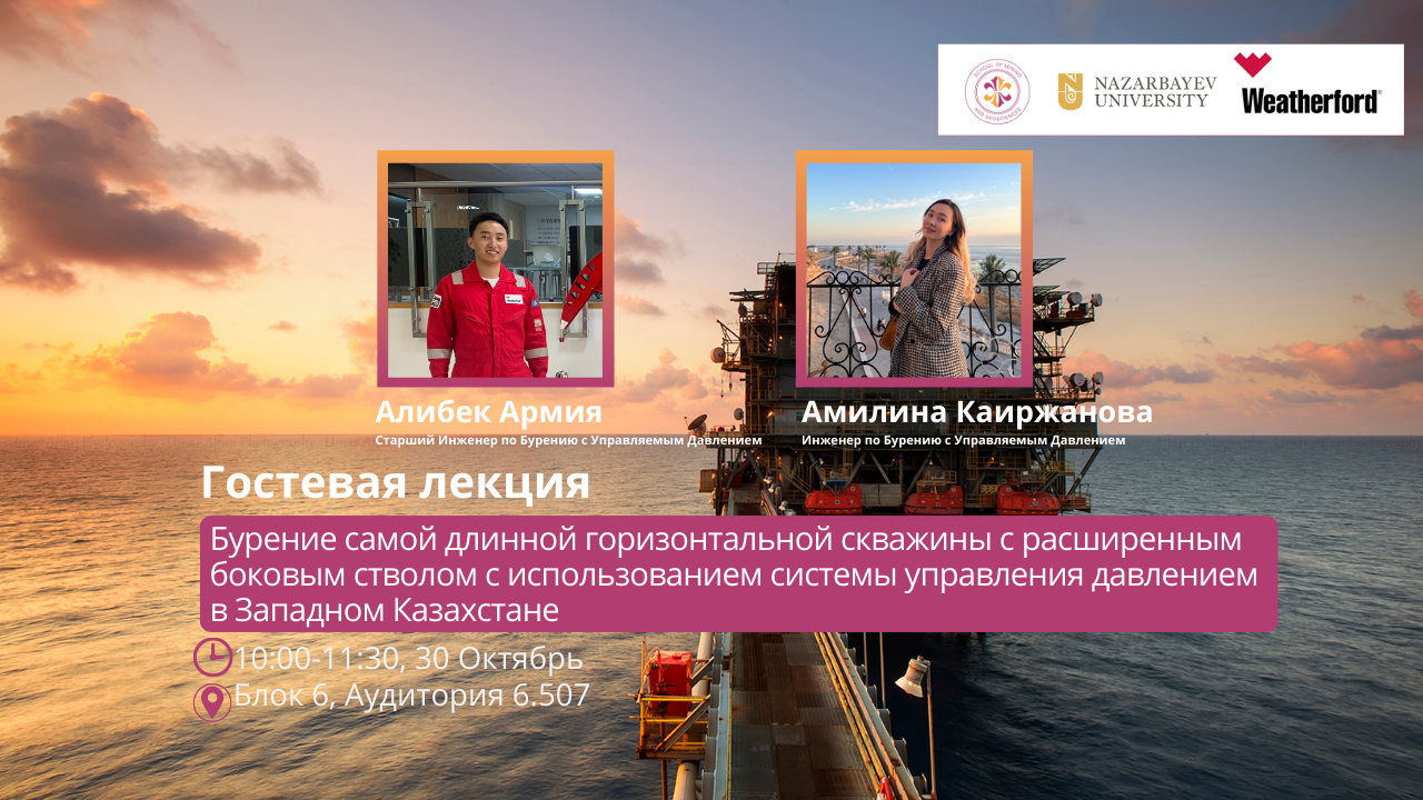 Мы рады продолжить нашу ежегодную серию гостевых лекций и приглашаем вас на специальное занятие с Алибеком Армия, старшим инженером по бурению с управляемым давлением, и Амилиной Каиржановой, инженером по бурению с управляемым давлением, обоих из компании Weatherford. Эта встреча предоставит студентам ценные знания и поможет укрепить связь между академическими знаниями и практическим применением.